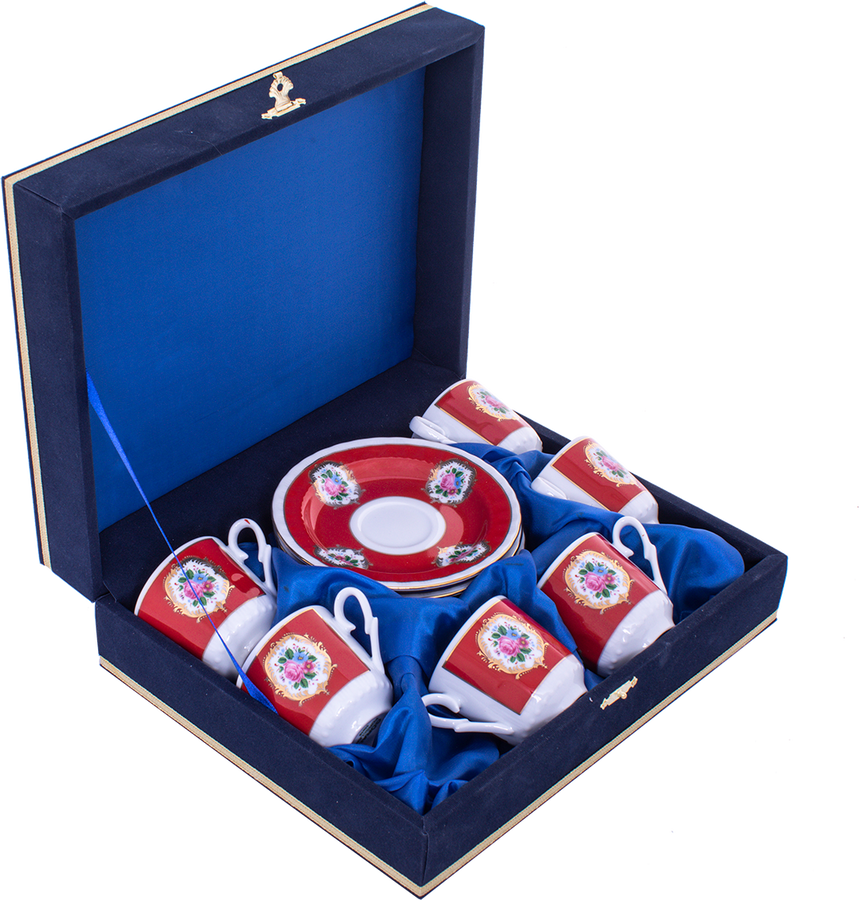 Güral Porselen Kırmızı Hediyelik Renkli Fincan Takımı 6lı - 12 Parça Kadife Kutulu ORN 600